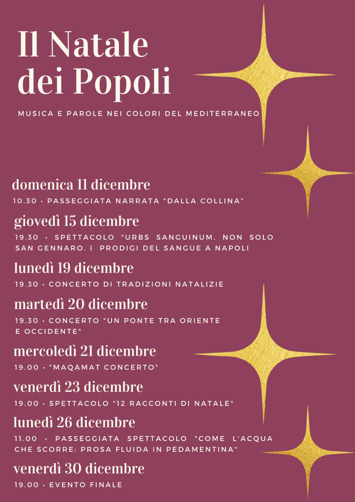 In programma nove eventi gratuiti, con la direzione artistica di Pasquale Gallifuoco, Guido Liotti e Livia Bertè, coordinamento tecnico di Luisa Fazzari, per conoscere, comprendere e respirare le ricchezze espressive delle atmosfere natalizie euro-mediterranee. Da quella copta e maronita di origini libano-egiziane, ai canti e alla musiche della Natività di origini maltesi, passando attraverso le suggestioni dei suoni mediorientali con strumenti musicali e canti liturgici della tradizione giudaica, africana, islamica e bizantina. Non mancano anche rappresentazioni dedicate alla secolare arte presepiale e alle ritualità sacre e profane tipiche della tradizione partenopea, legate al miracolo della liquefazione del sangue, alla figura femminile partenopea e alle fiabe popolari campane del Seicento e del Settecento di R. De Simone.